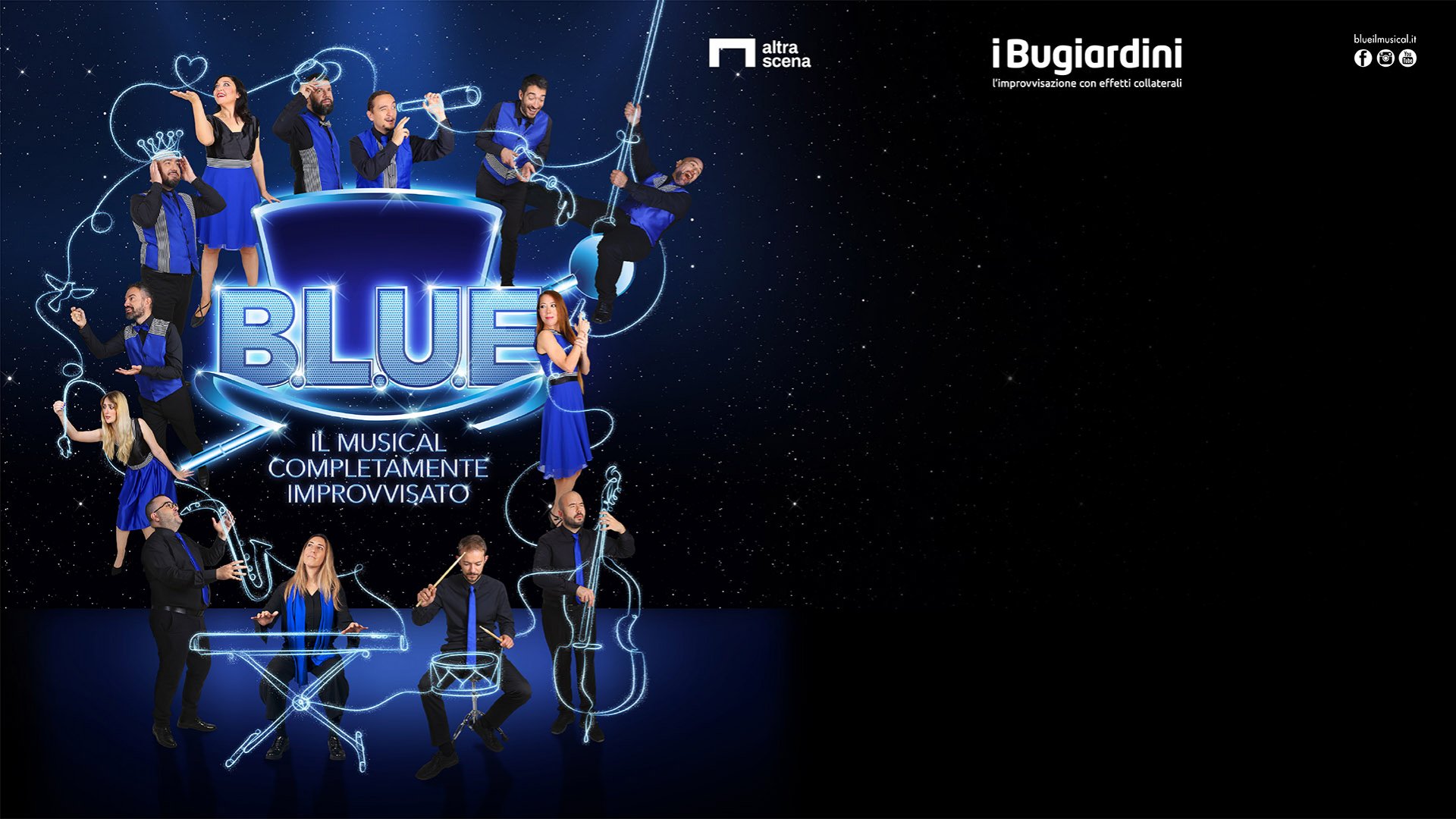 Il musical improvvisato è un genere molto diffuso e affermato nei paesi anglosassoni. I Bugiardini, forti di una lunga esperienza nel campo dell'improvvisazione teatrale, hanno deciso di raccogliere in Italia la funambolica sfida di essere contemporaneamente attori, cantanti, compositori e ballerini. Il risultato è B.L.U.E. – il musical completamente improvvisato.